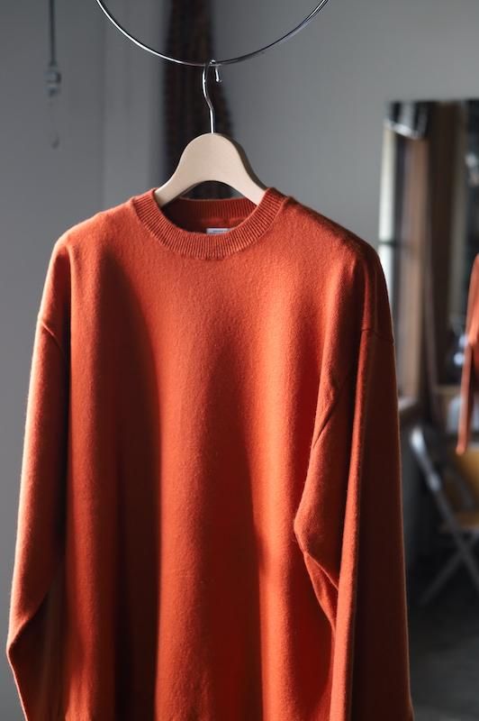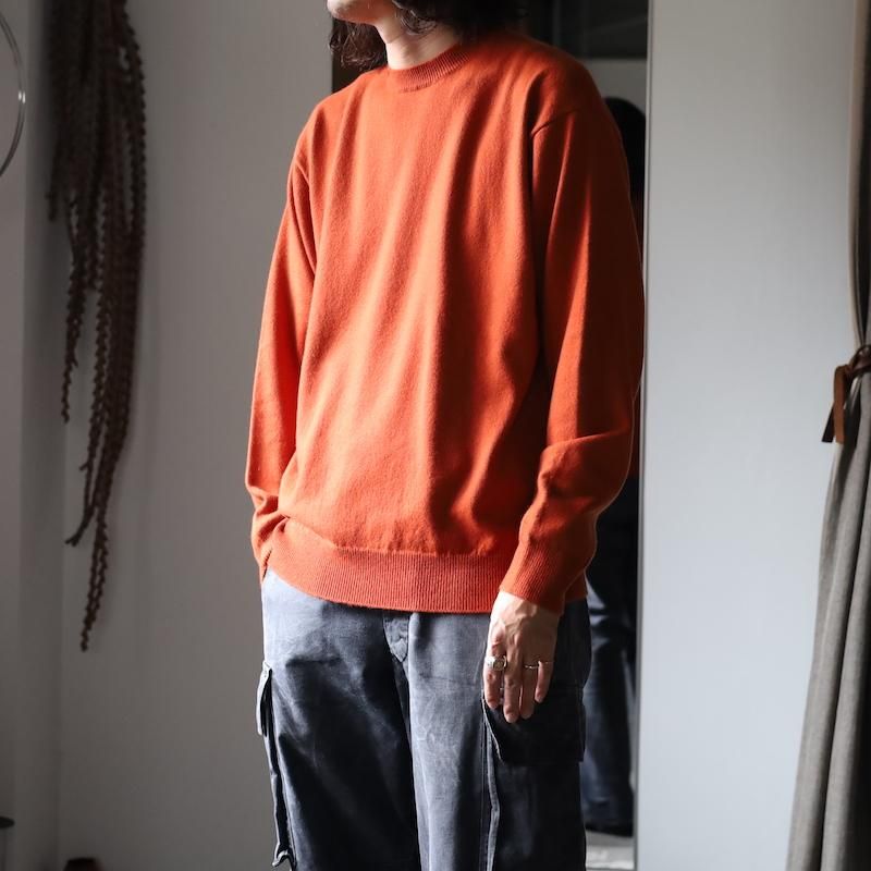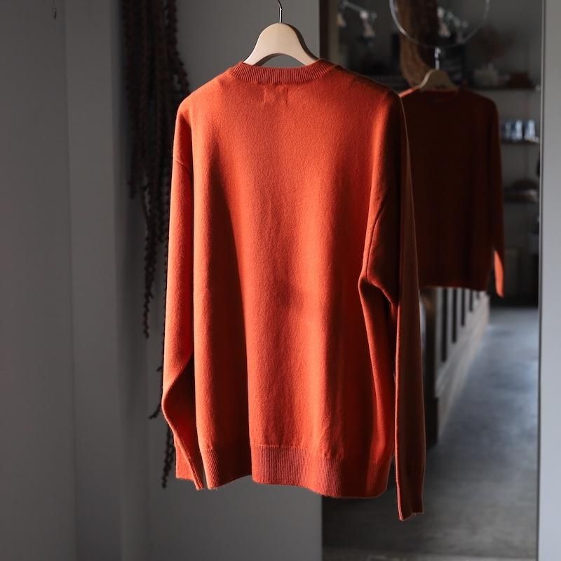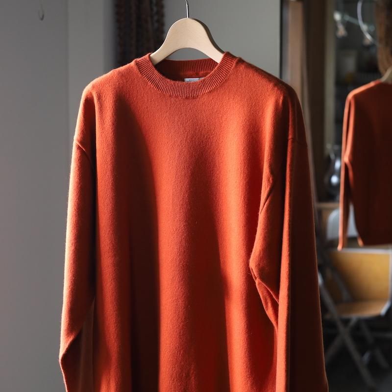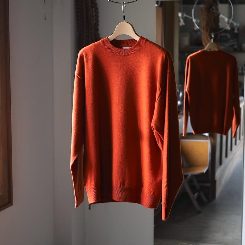 目指したのは、日常で気兼ねなく着れて、着込むほどに身体に馴染んでくる、デニムのようなカシミヤセーター。 カシミヤ糸を贅沢に使用し、時間をかけて緻密に編み込むことで、カシミヤセーターのイメージを覆す、硬く丈夫な風合いを実現しています。デイリーに着用いただけるよう、ご家庭で手洗いも可能。シルエットは、ハリのある生地を活かして、ヴィンテージスウェットのようなデザインに落とし込んでいます。