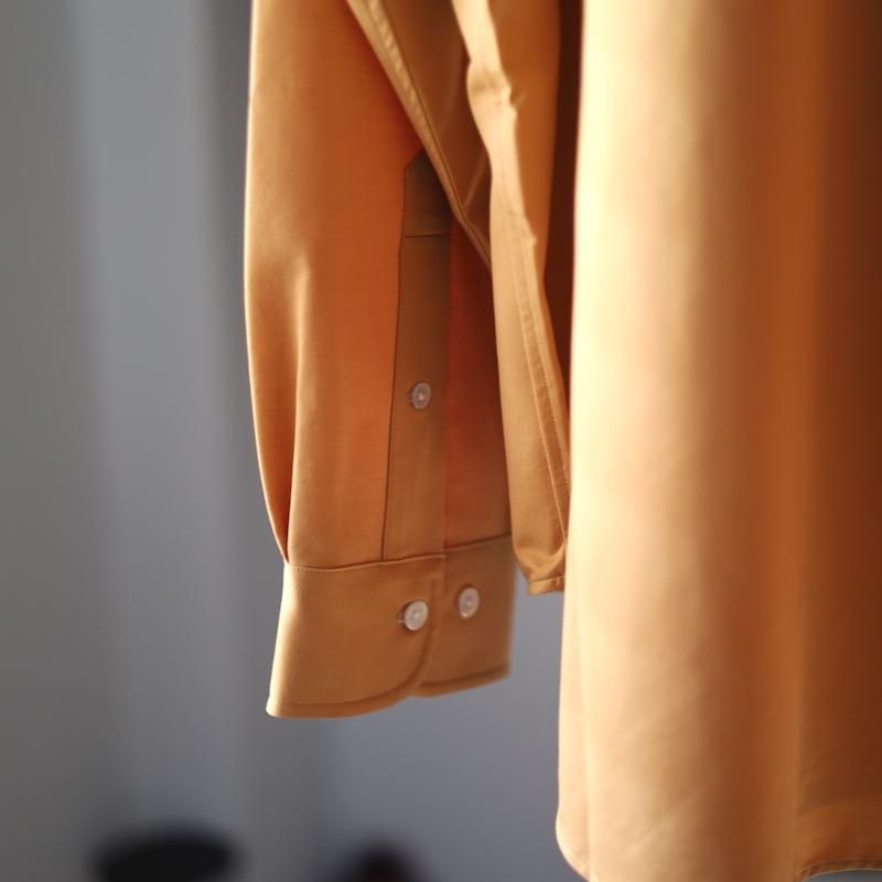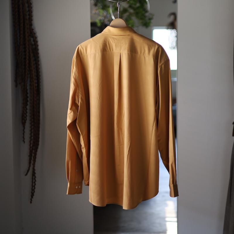 ディティールは、ドレスシャツを採用し全て巻き伏せ本縫い仕様、貝蝶釦使いです。素材のハリ感、光沢感がある為、オーバーパターンですがカジュアルになりすぎない、生地が生み出すドレッシー感とパターンが生み出すカジュアル感を融合させた、ラグジュアリールーズな唯一無二のシャツ。