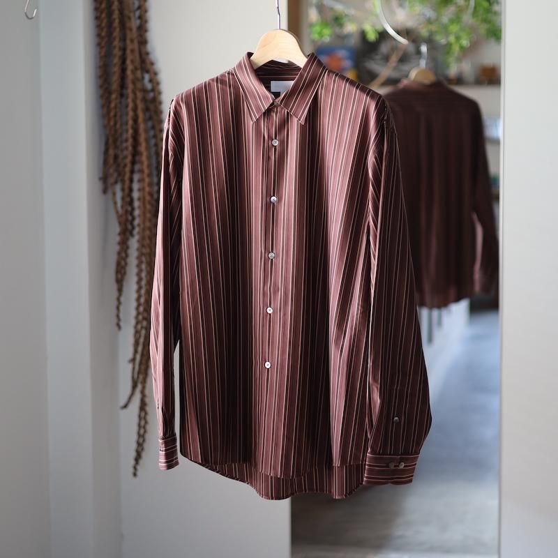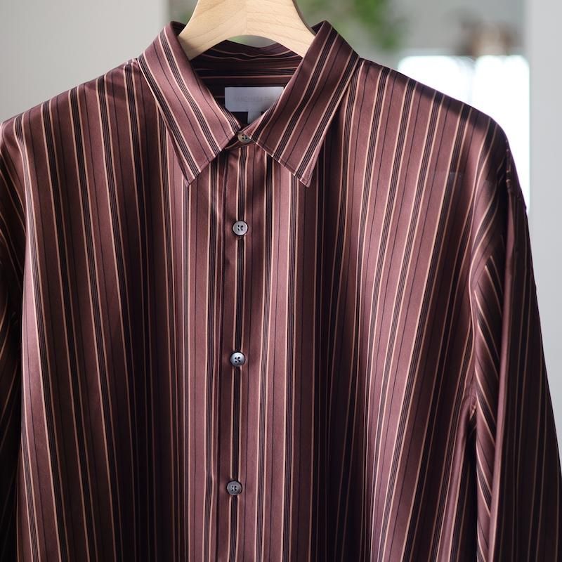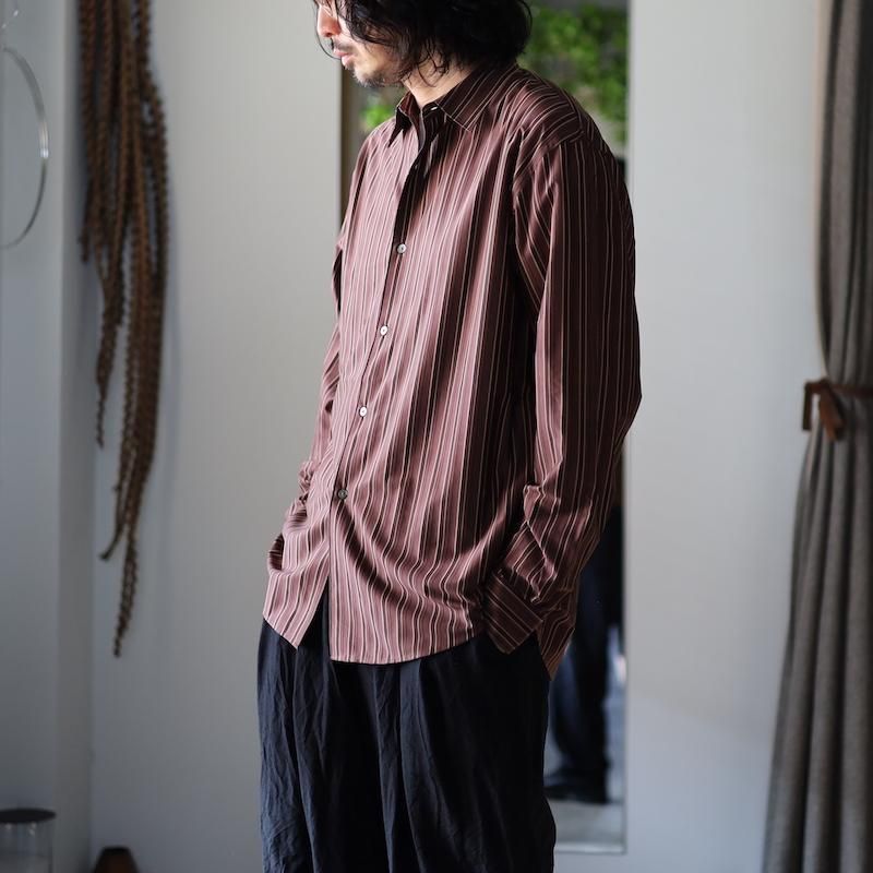 ディティールは、ドレスシャツを採用し全て巻き伏せ本縫い仕様、貝蝶釦使いです。素材のハリ感、光沢感、そして塩梅の良いシルエット、生地が生み出すドレッシー感とパターンを融合させた、唯一無二のシャツ。
