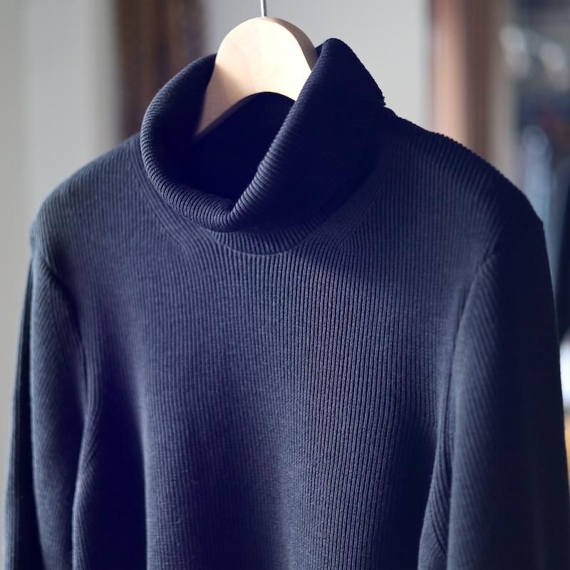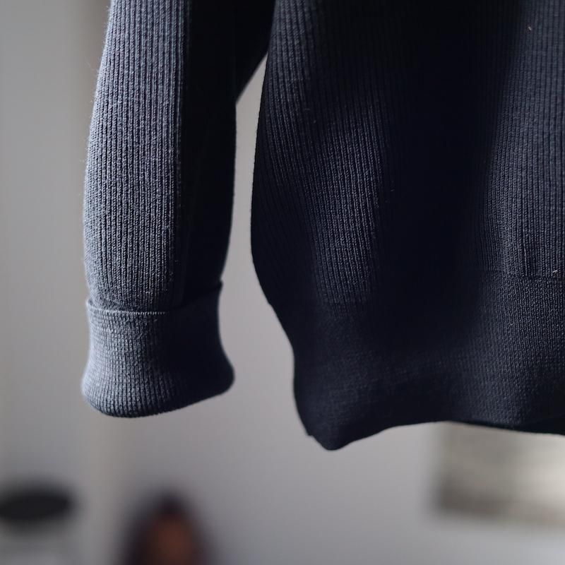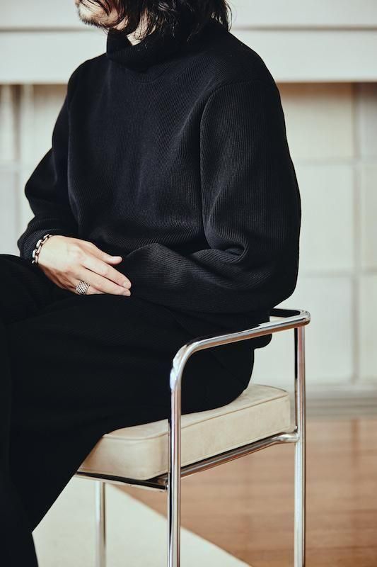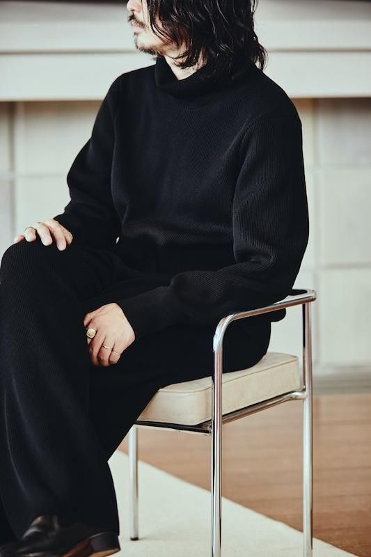 こちらはエアリーな膨らみのあるポリエステルウールの複合糸を採用。ミドルゲージの両畦編みとなっており、上品な印象となっております。