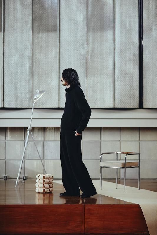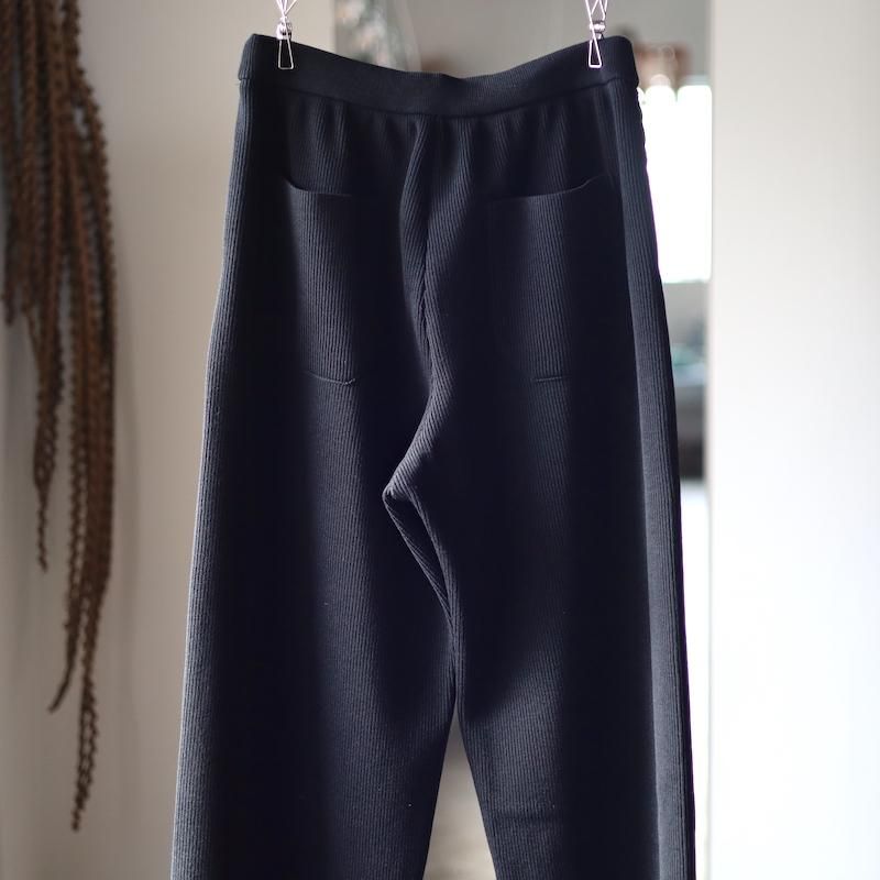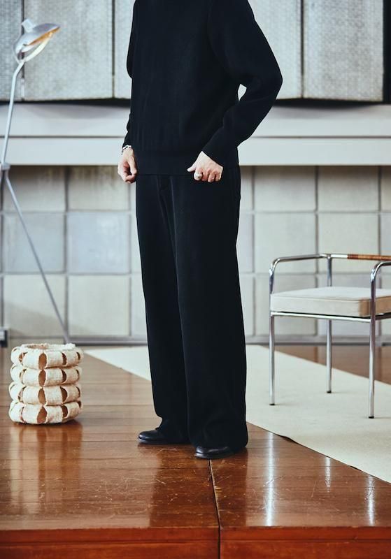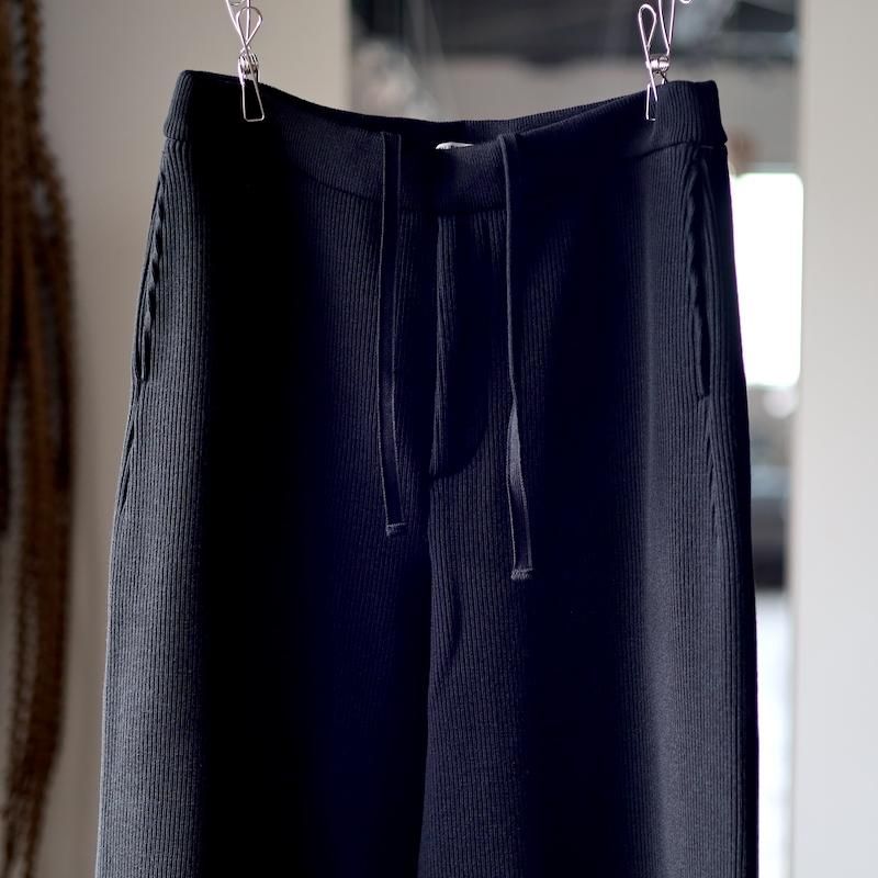 シルエットはワイドストレートパンツです。美麗なシルエットを引き立たせるサイドシームレスな一本。ニットパンツでありながらスラックスのように上品に穿くことができます。イージーパンツ仕様。