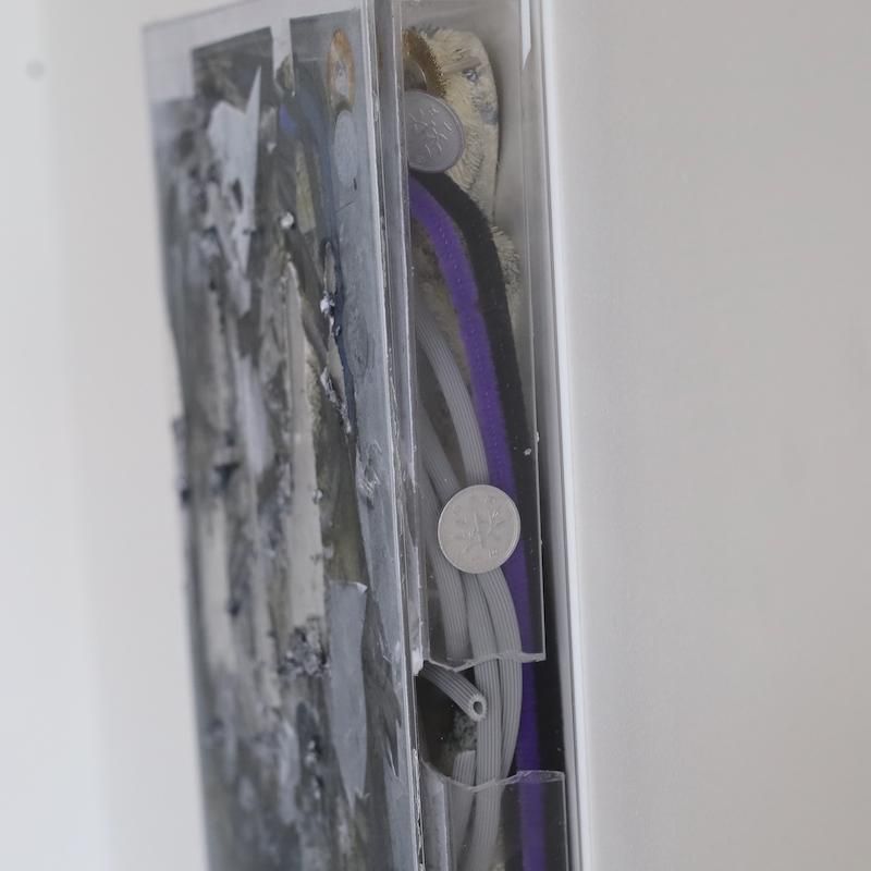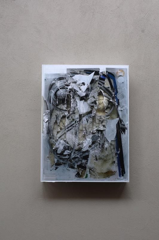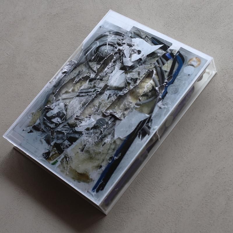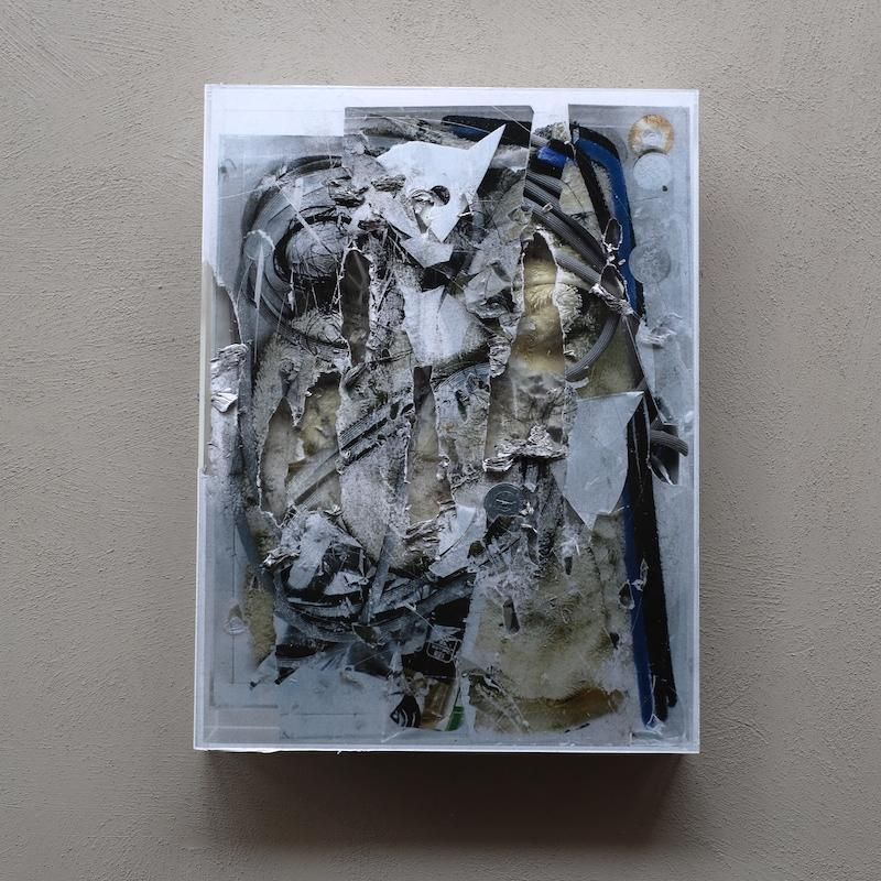 透明なアクリルボックスに日用品の断片を封じ込め、それを撮影し、コンビニでプリントした写真を表面に貼り付ける。