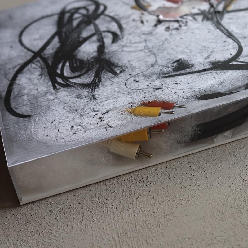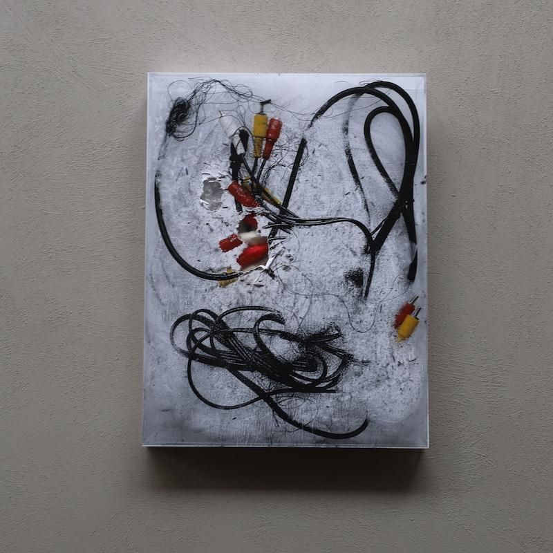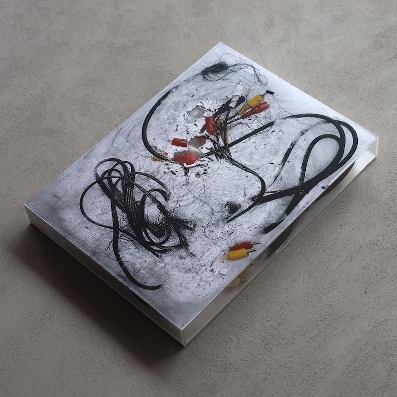 透明なアクリルボックスに日用品の断片を封じ込め、それを撮影し、コンビニでプリントした写真を表面に貼り付ける。