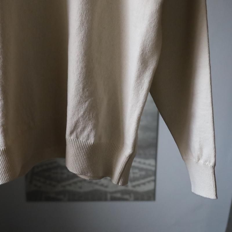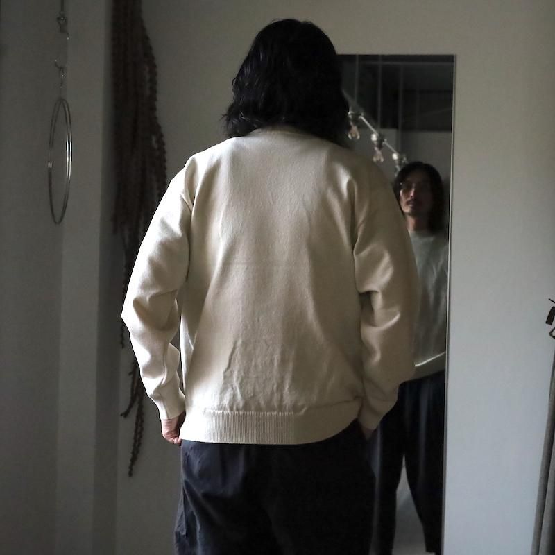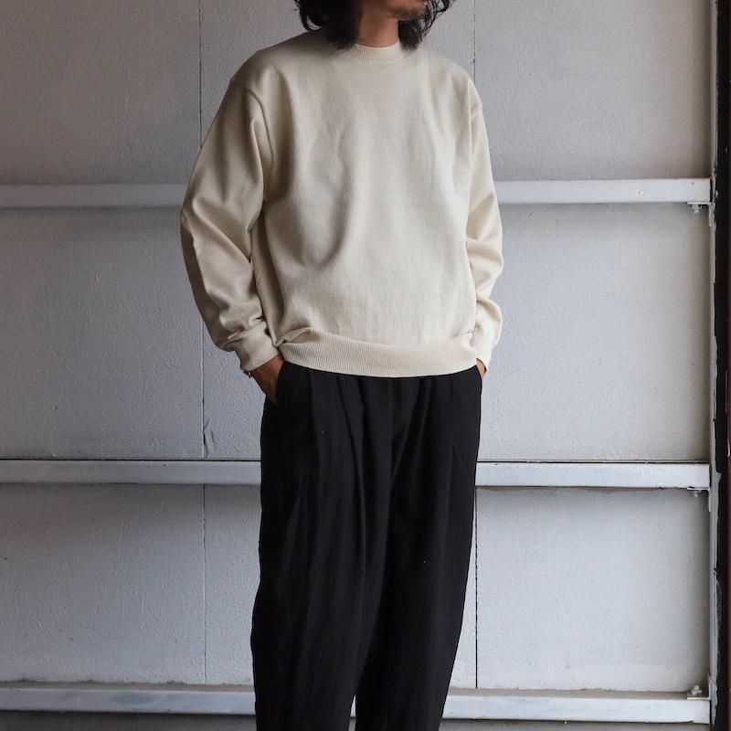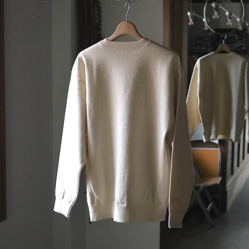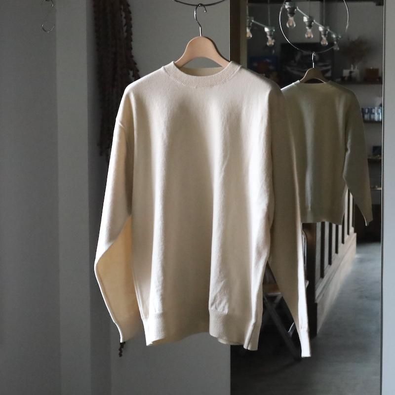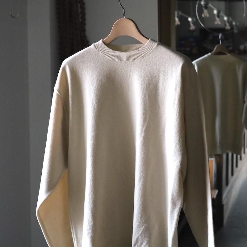 目指したのは、日常で気兼ねなく着れて、着込むほどに身体に馴染んでくる、デニムのようなカシミヤセーター。 カシミヤ糸を贅沢に使用し、時間をかけて緻密に編み込むことで、カシミヤセーターのイメージを覆す、硬く丈夫な風合いを実現しています。デイリーに着用いただけるよう、ご家庭で手洗いも可能。シルエットは、ハリのある生地を活かして、ヴィンテージスウェットのようなデザインに落とし込んでいます。