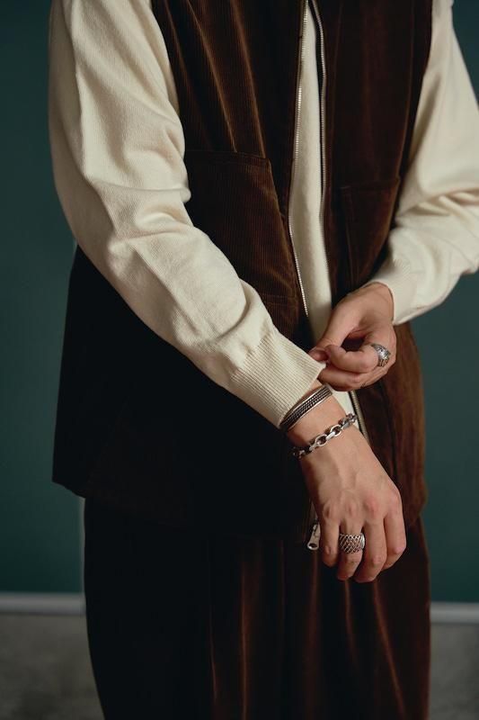 経年変化を楽しんでもらうため、ニット製品には欠かせない‛洗い’や‛染め’の製品加工を一切施さず、リジッドの(硬い)状態で製品化。ワークウエアを思わせる紡績油特有の匂いも魅力の一つです。 硬さが残った状態から、着込むごとにカシミヤらしい柔らかな風合いに育っていきます。
