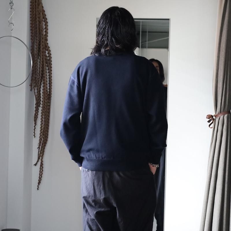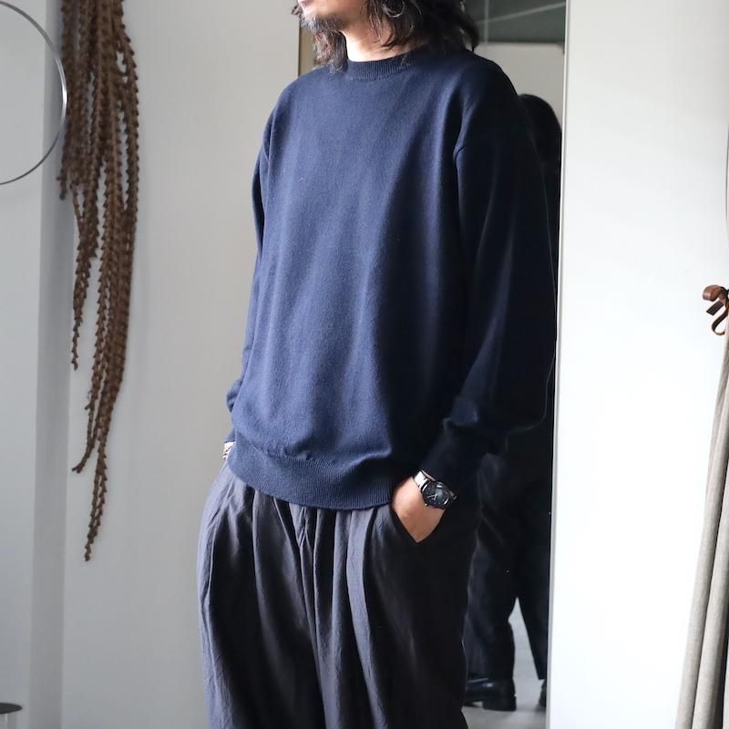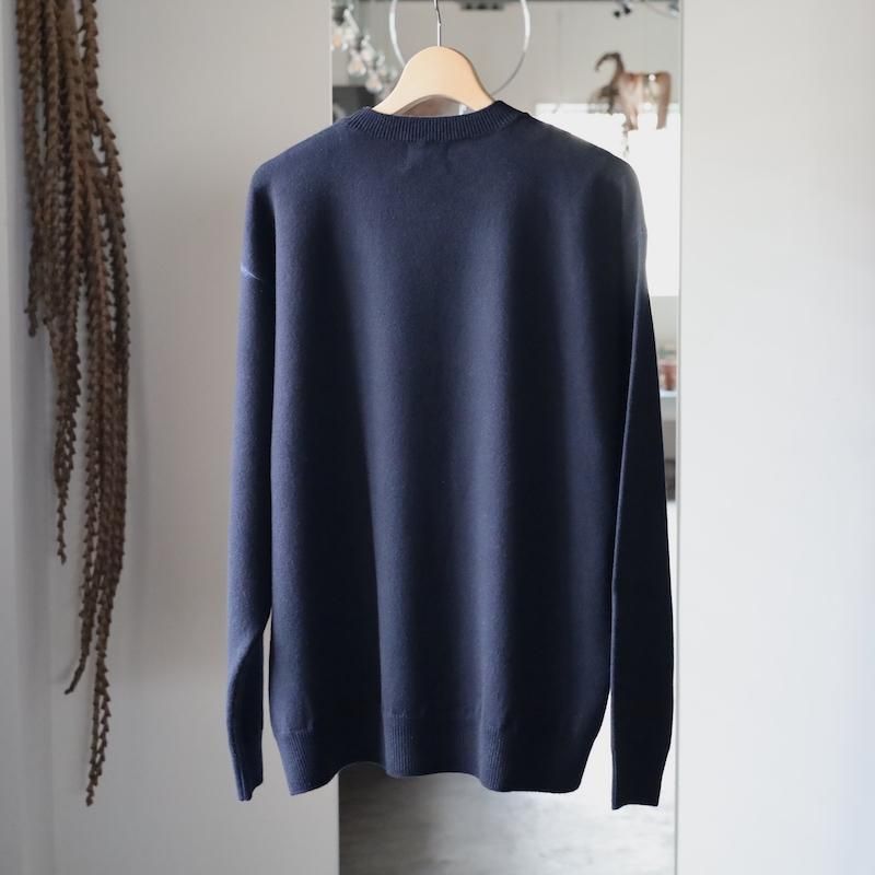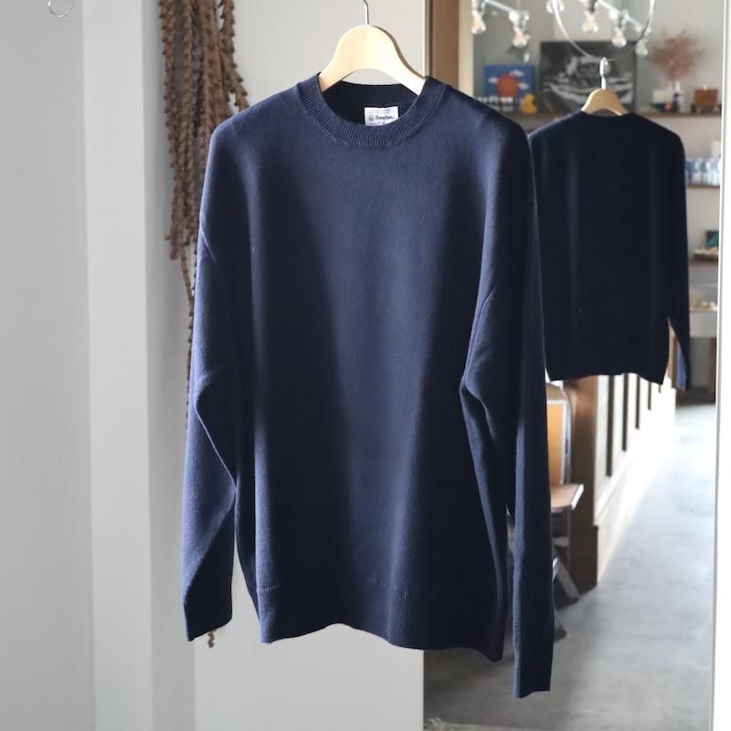 目指したのは、日常で気兼ねなく着れて、着込むほどに身体に馴染んでくる、デニムのようなカシミヤセーター。 カシミヤ糸を贅沢に使用し、時間をかけて緻密に編み込むことで、カシミヤセーターのイメージを覆す、硬く丈夫な風合いを実現しています。デイリーに着用いただけるよう、ご家庭で手洗いも可能。シルエットは、ハリのある生地を活かして、ヴィンテージスウェットのようなデザインに落とし込んでいます。